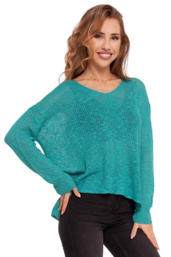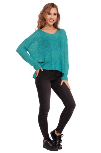 Z tyłu sweterka znajduje się delikatnie wydłużony fason, który zapewnia dyskretną pokrycie i dodaje współczesnego charakteru. Boczne rozcięcia zwiększają swobodę ruchów i nadają sweterkowi lekkości, umożliwiając stylowe noszenie go na wierzchu.