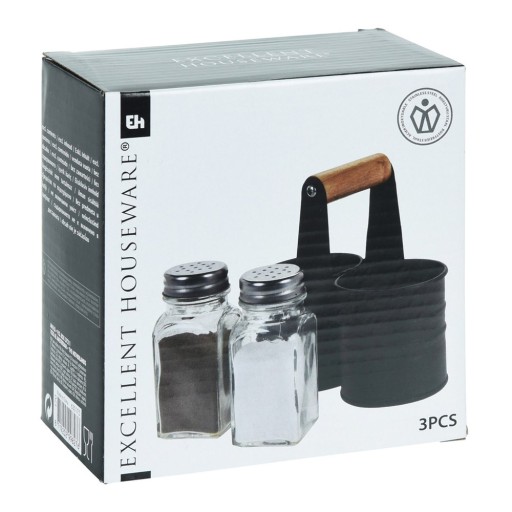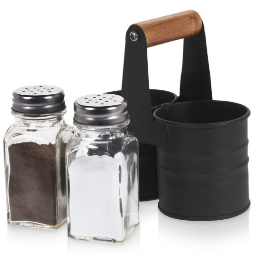 Szklany zestaw solniczki i pieprzniczki, które są umieszczone w praktycznym stojaku wykonanym z metalu. Stojak posiada wygodny uchwyt, który ułatwi przenoszenie przypraw. Wymiary stojaka to 14 x 7 x 13 cm. Świetnie sprawdzi się do użytku domowego, jak również do gastronomii. Wyprodukowano zgodnie z europejskimi standardami.