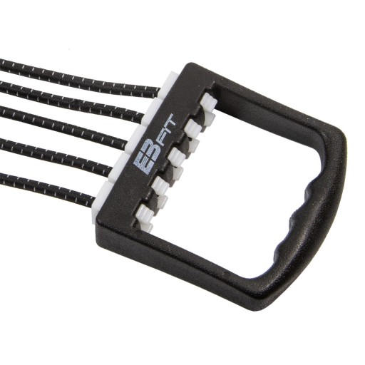 Przyrząd składa się z pięciu lateksowych odczepianych gum, co pozwala regulować poziom trudności ćwiczeń i kontrolować postępy.