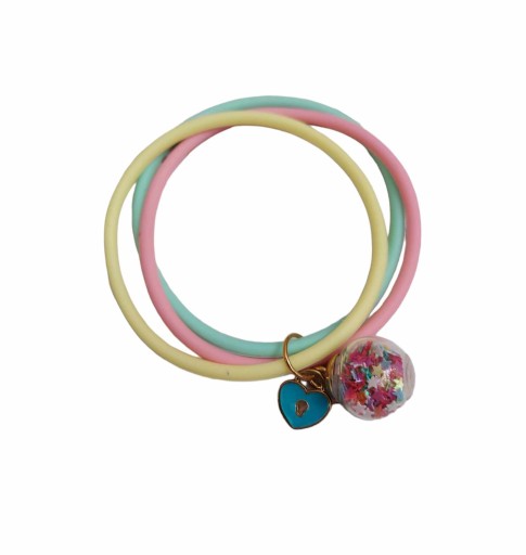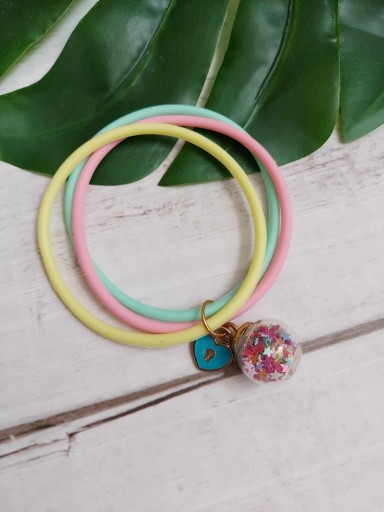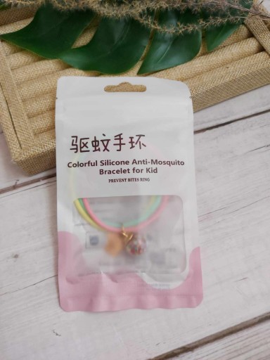 Bransoletka odstraszająca komary wykonana z elastycznych gumek silikonowych w kolorach pastelowych z ozdobnymi zawieszkami