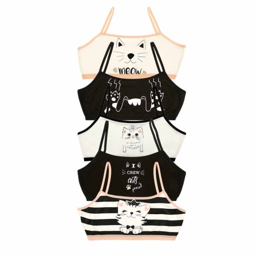 Śliczny zestaw 5 sztuk biustonoszy dziecięcych z motywem kotów. W zestawie staniczki w kolorze czarnym i białym. Oferowane produkty przez LILLY BLING są świetnej jakości. Bielizna wykonana z wysoko gatunkowej miękkiej bawełny. Gumki miękkie, nie wyciągają się podczas użytkowania. Idealna na zajęcia sportowe jak również na co dzień.