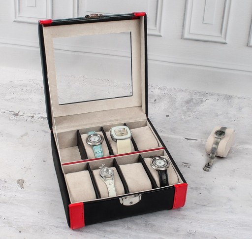 Czarna kasetka do przechowywania zegarków posiada osiem oddzielnych przegródek do przechowywania zegarków. W każdej przegródce znajduje się poduszka na zegarek, ułatwiająca przechowywanie. Wieczko jest częściowo przezroczyste, co pozwala także na ekspozycję znajdujących się w środku zegarków.