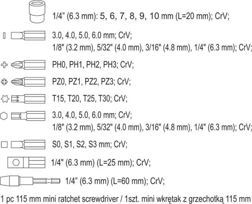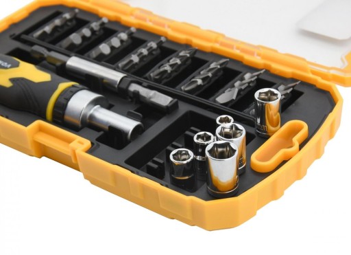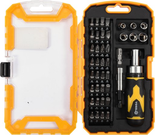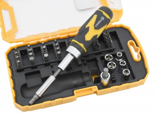 Wkrętak z grzechotką z wymiennymi bitami marki Vorel 64385. Posiada solidną rękojeść o ergonomicznym kształcie, wyposażone w grzechotkę z przełącznikiem –