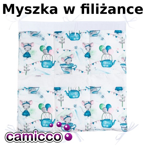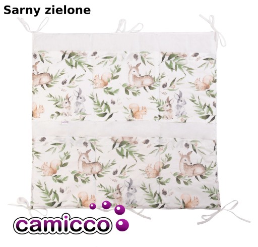 Przybornik pomieści niezbędne akcesoria w codziennej pielęgnacji Maluszka, do tego wspaniale ozdobi łóżeczko, posiada 6 kieszonek. Wiążemy go za pomocą sznureczków do szczebelków łóżeczka na wybranym przez siebie miejscu i wysokości
