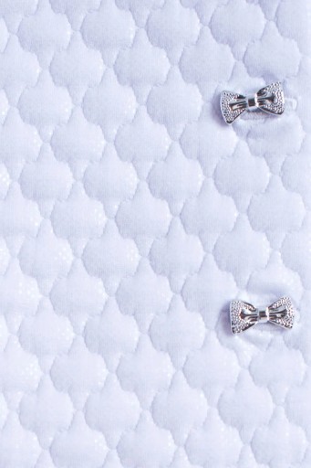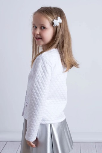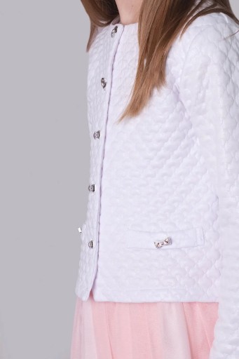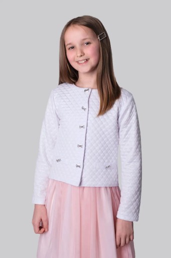 Stylowy i elegancki, biały żakiet dla dziewczynki. Wykonany z połyskującego materiału z fakturą. Zapinany na ozdobne, połyskujące guziki w kształcie kokardek. . Idealny na wyjątkowe i uroczyste okazje. Sprawdzi się również w casualowych stylizacjach małej modnisi. Dostępny w różowym i białym kolorze oraz rozmiarach 122 - 158. Produkt polski.