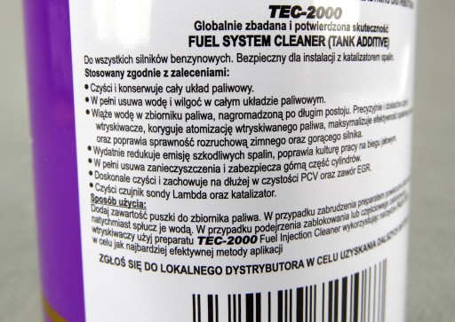 TEC-2000 Fuel System Cleaner uszlachetniacz do benzyny stosuje się wlewając zawartość puszki do zbiornika paliwa. Zaleca się żeby zbiornik był pełny.