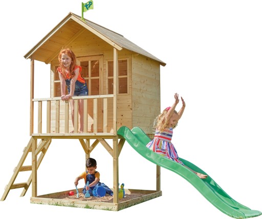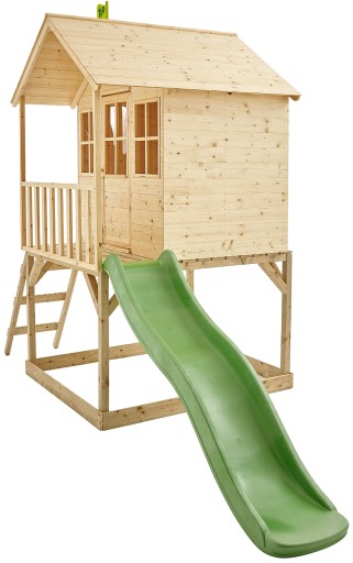 Ten uroczy przestronny drewniany domek na palach z werandą stanie się ulubionym miejscem do zabawy i spędzania czasu na świeżym powietrzu. Domek został wykonany z naturalnego, certyfikowanego drewna FSC, co nadaje mu rustykalny i przytulny wygląd. Domek jest przestronny i wygodny a podłoga wyłożona jest wytrzymałymi deskami. Maksymalna łączna waga użytkowników domku to 150kg. Dzięki temu dzieci będą miały duże, mocne, wygodne i bezpieczne miejsce do zabawy.