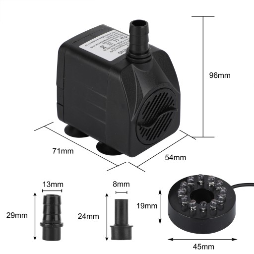 długi kabel (1,5 m) dla łatwej instalacji i obsługi. 4 mocne przyssawki na spodzie pompki pomagają utrzymać ją w miejscu, można ją zamontować pionowo lub poziomo na szklanej powierzchni. Pompa wody fontannowej jest łatwa do czyszczenia i nie wymaga żadnych narzędzi ani akcesoriów do demontażu.