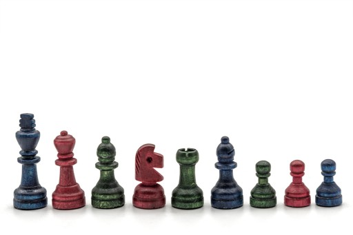 Komplet stanowi kaseta z planszą szachową, zestaw figur szachowych w kolorach wiśniowym, niebieskim i zielonym po 16 elementów w każdym oraz wielojęzyczna instrukcja.