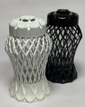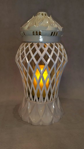 Piękny duży nowoczesny znicz, zrobiony z białego tworzywa oraz szklanego słoju.