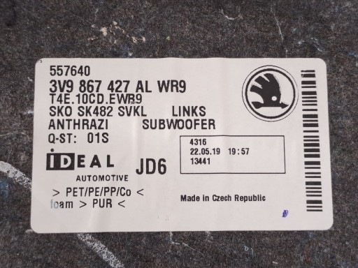 BOCZEK BAGAŻNIKA LEWY POD SUBWOOFER SKODA SUPERB 3 III 19r KOMBI