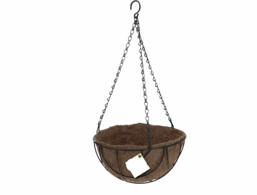 Kwietnik do zawieszenia na metalowym łańcuszku zakończonym haczykiem, kosz wykonany z metalowego drutu, wyściółka z włókna kokosowego