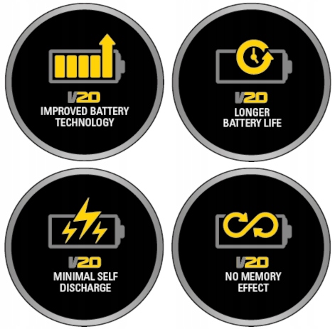 - Dzięki ulepszonej technologii akumulatorów, braku efektu pamięci i minimalnemu samorozładowaniu, akumulator litowo-jonowy V20 jest gotowy do pracy w każdym miejscu i o każdej porze - i będzie działał dłużej