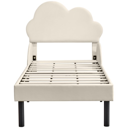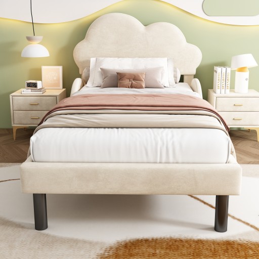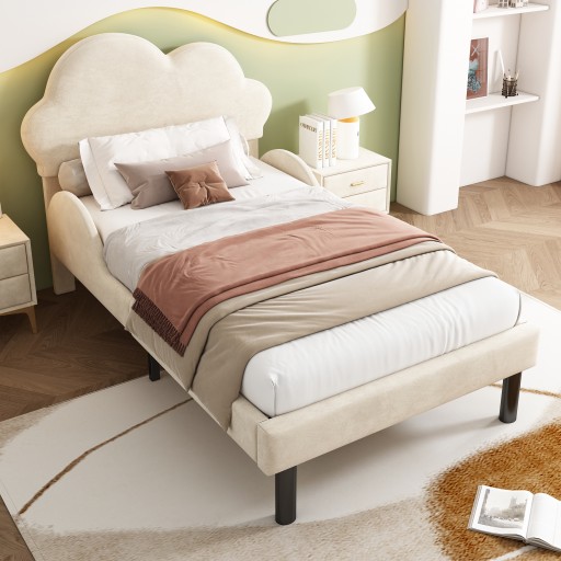 Luksusowe łóżko tapicerowane aksamitnie miękkie z zagłówkiem w kształcie chmurki, zaokrąglonymi poręczami bocznymi i dużą przestrzenią do przechowywania, 90*200cm, beżowy