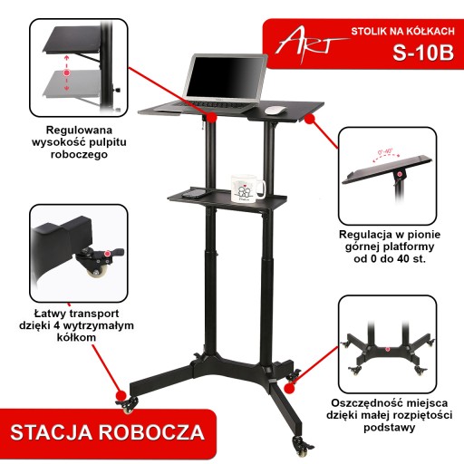 Stolik na kółkach/stacja robocza ART model S-10B to idealne rozwiązanie dla tych, którzy poszukują wszechstronnego i ergonomicznego miejsca pracy. Zaprojektowany z myślą o wygodzie i funkcjonalności, ten stolik spełnia potrzeby użytkowników, którzy potrzebują miejsca na notebooka, projektor, monitor i inne urządzenia.
