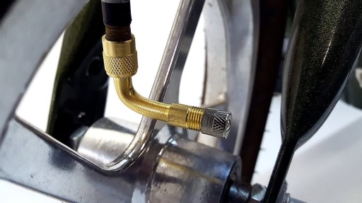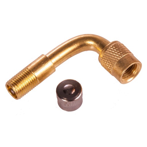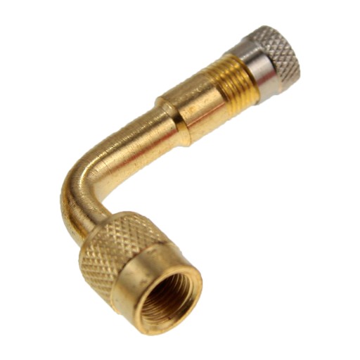 Metalowa przedłużka kątowa 90°, która ma szczególne zastosowanie w kołach samochodów dostawczych, ciężarowych i autobusowych. Dzięki niej mamy lepszy dostęp do zaworu w feldze koła bliźniaczego. Przedłużka posiada gumową uszczelkę, metalowy kapturek z uszczelką oraz wkładkę sprężynową zaworu. Produkt wygięty jest pod kątem 90° z średnicą gwintu 8 mm pasującą do większości zaworów.