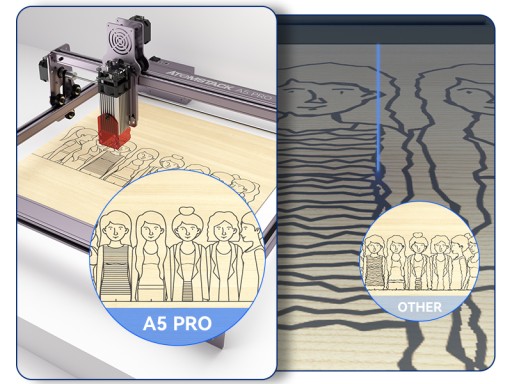 Wycinarka laserowa A5 Pro o mocy wyjściowej 5 ~ 5,5 W z obszarem ogniskowania lasera o bardzo drobnej kompresji 0,16 mm, całkowicie grawerowania sięga 0,01 mm, co zapewnia bardziej wyrafinowany proces grawerowania, ułatwiając cięcie na drewnie i akrylu