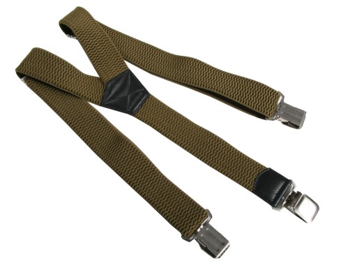 Metalowe klamry mocno trzymają spodnie.