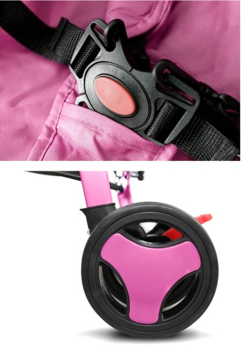 Obszyty tkaniną z piankowym, miękkim wypełnieniem, zapewnia bezpieczeństwo i ochronę przed wypadnięciem z wózka.