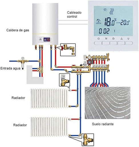 - Kontrola temperatury: termostat rozpoznaje temperaturę otoczenia za pomocą wbudowanego czujnika, a jeśli okaże się, że temperatura jest niższa niż zaprogramowana temperatura komfortowa, wysyła sygnał do ogrzewania, aby włączyć urządzenie. To samo dzieje, gdy temperatura jest wyższa niż ustawiona temperatura: wówczas przełączanie zostanie przerwane.