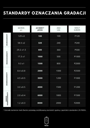 Niestety większość producentów kamieni ostrzących nie podaje, według którego standardu są oznaczone ich produkty. W wielu przypadkach oznaczenie gradacji jest jedynie szacunkowe. Ostrzałki kamienne Bacher posiadają certyfikowaną ziarnistość zgodnie z japońskim standardem JIS R6001.