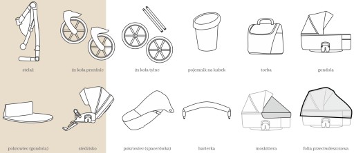 Budka składa się z dwóch klinów. Posiada chowany daszek, system regulacji, rączkę do przenoszenia, a także okno wentylacyjne z moskitierą. Budka, gondola i pokrowiec wykonane materiału bądź aksamitu, wewnątrz znajduje się bawełniany materacyk. Gondola posiada wbudowaną moskitierę, którą można założyć na budkę oraz dodatkową kieszeń wewnętrzną