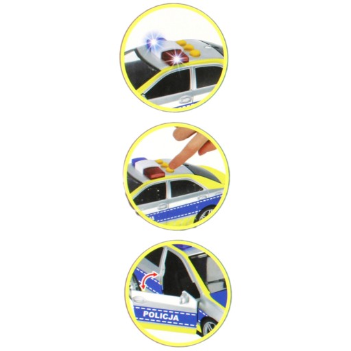 Auto osobowe dopracowane w każdym szczególe, wnętrze wyposażone jest we wszystkie elementy prawdziwego pojazdu (kierownica, deska rozdzielcza, siedzenia). Pojazd posiada dźwięki oraz efekty świetlne, włączane przyciskami umieszczonymi na dachu pojazdu. Samochód posiada funkcję pull&back, dzięki czemu po pchnięciu pojazdu do przodu kontynuuję jazdę samodzielnie. Po naciśnięciu przycisku dziecko usłyszy lektora mówiącego m.in.: