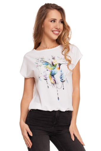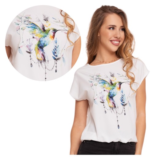 Największym atutem tej bluzki jest przyciągający wzrok nadruk kolibra, który jest nie tylko kolorowy, ale i bogato zdobiony błyszczącymi cyrkoniami, dodającymi całości luksusowego charakteru. Te lśniące akcenty delikatnie mienią się w świetle, co sprawia, że bluzka staje się centrum uwagi.