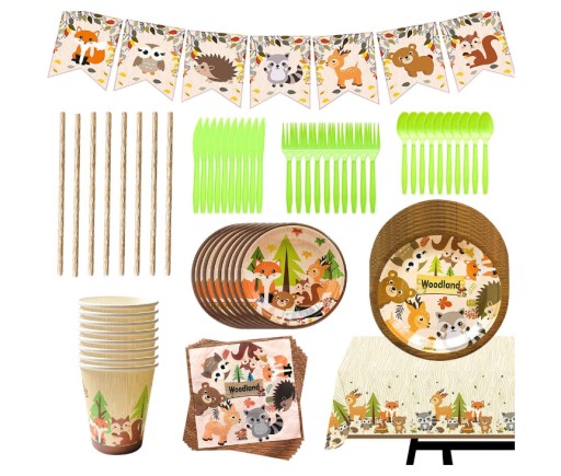 Zestaw Urodzinowy Zwierzęta Leśne Talerzyki Kubki Serwetki dla 20 osób 177 sztuk