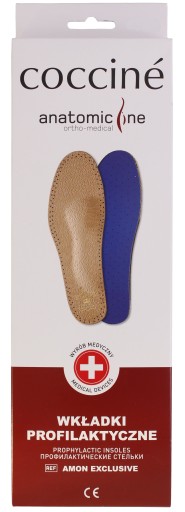COCCINE SKÓRZANE WKŁADKI ORTOPEDYCZNE 37-38: Wkładki profilaktyczne AMON EXCLUSIVE - przeznaczone dla osób ze stopami z płaskostopiem poprzecznym i podłużnym. Specjalistyczne wkładki pełne, zapobiegają opadaniu sklepienia poprzecznego stopy i podpierają sklepienie podłużne, umożliwiają prawidłowe obciążenie stopy. Posiadają wysoką zdolność absorpcji energii powstałej w wyniku wstrząsów, chroniąc stawy kolanowe i biodrowe, a także dolny odcinek kręgosłupa oraz usuwając zmęczenie stóp. Zapewniają wyjątkowy komfort podczas chodzenia. Mogą być stosowane w profilaktyce odparzeń. Wkładki wykonane są z materiału lateksowego o właściwościach SHOCK ABSORBER oraz pokryte są skórą owczą posiadającą właściwości chłonne wilgoci (potu). Zalecane są do stosowania dla osób ze stopami wrażliwymi oraz wykonującymi prace wymagające częstego stania i chodzenia (np.: fryzjerzy, sprzedawcy, magazynierzy, pielęgniarki, itp..) Specyfikacja produktu: