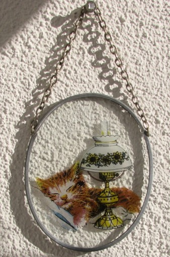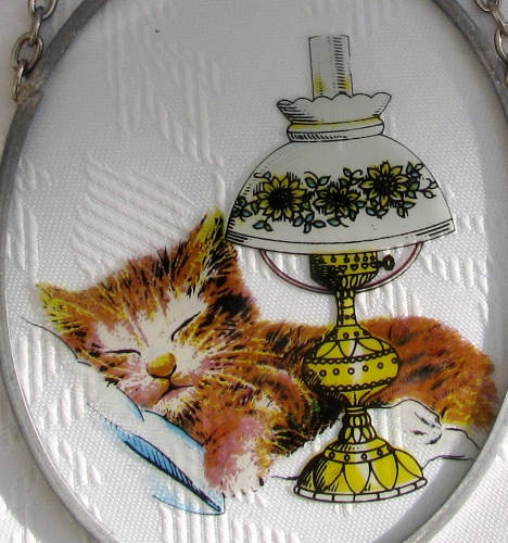 Oferuję witraż okienny. Szkło oprawione w cynę, ozdobiony ręcznie malowanym śpiącym kotkiem.