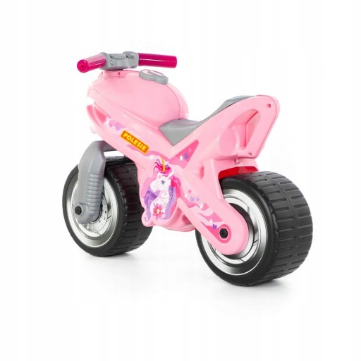 Rodzice docenią wygodę przenoszenia motocykla: w tym celu za siedzeniem znajduje się uchwyt. Wózek jest dostępny w kolorze różowym i szarym z motywem jednorożca. Naklejka nie ściera się, ponieważ jest wykonana w technologii IML.