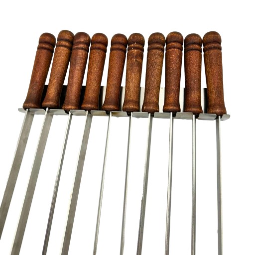 Szpikulce posiadają ostrą końcówkę do nabijania oraz drewnianą rączkę która gwarantuje pewny pochwyt podczas grillowania oraz zapewnia bezpieczeństwo przed oparzeniem się podczas obracania szampura, a wieszak zapewni bezpieczne przechowywanie szpadów.