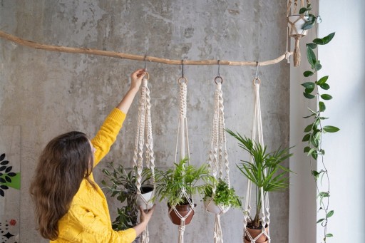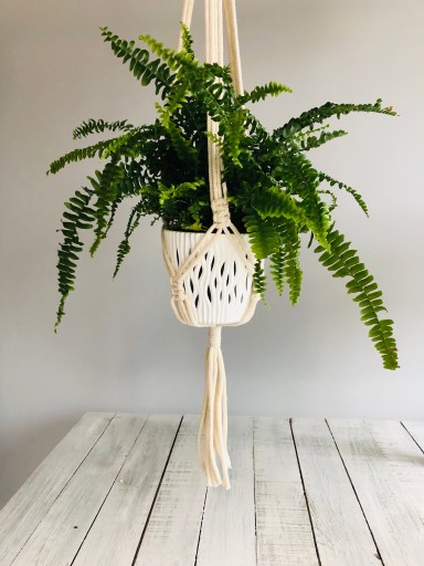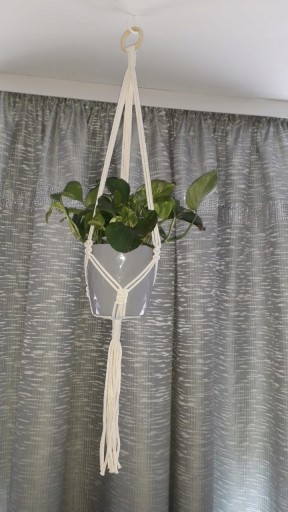 Kwietnik posiada drewniane kółko, żeby można było go wygodnie zawiesić na haczyku pod sufitem, na ozdobnym haku przy ścianie lub przewiesić przez drewniany kijek tworząc kompozycję z kilku kwietników.