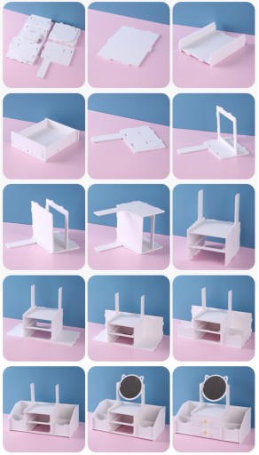 Posiada niewielkie szufladki oraz przegródki do przechowywania kosmetyków lub biżuterii.