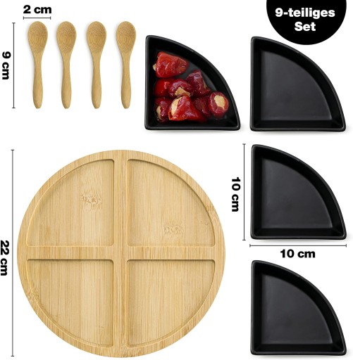 Ten 9-częściowy zestaw do serwowania składa się z 4 miseczek na przekąski z ceramiki z praktycznym półmiskiem do serwowania z bambusa, w zestawie 4 łyżki do serwowania. Idealny do każdego posiłku: śniadanie, kolacja lub przekąska w międzyczasie.