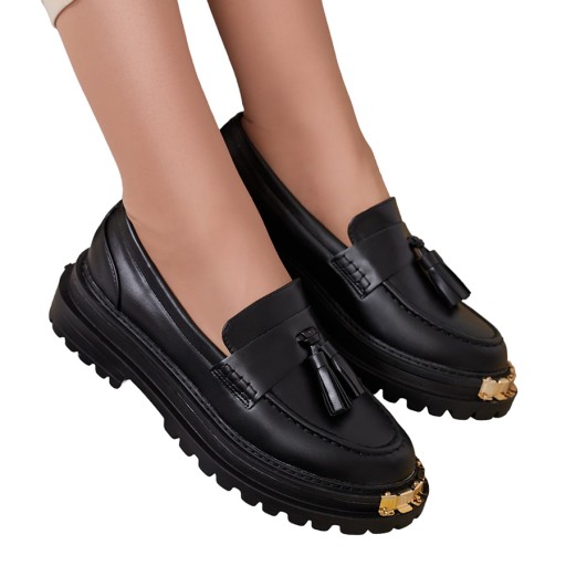 Rewelacyjne mokasyny damskie na grubszej podeszwie, wykonane ze skóry ekologicznej oraz eko skórzanej wkładki. Z ozdobnymi frędzelkami na nosku. Dodadzą blasku każdej stylizacji!