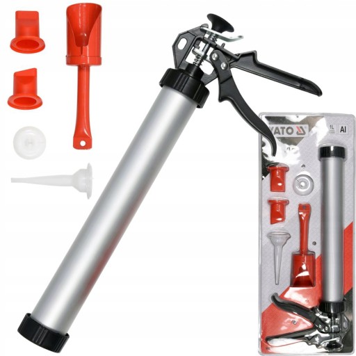 Wyciskacz do mas szpachlowych nakładanych luzem. /np. zapraw, szpachli ,fug. Pojemnik wykonany z rury aluminiowej o długości 380 mm i objętości 1 l wyposażony jest w bardzo silny mechanizm tłoczący. W zestawie znajdują się trzy różne końcówki do aplikacji mas, zapasowy tłok i specjalnie profilowana łopatka do nakładania masy.