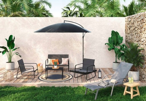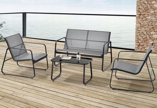 W zestawie znajdują się: stolik, 2 krzesła z wygodnymi podłokietnikami, 2-osobowa wygodna sofa oraz zestaw montażowy.