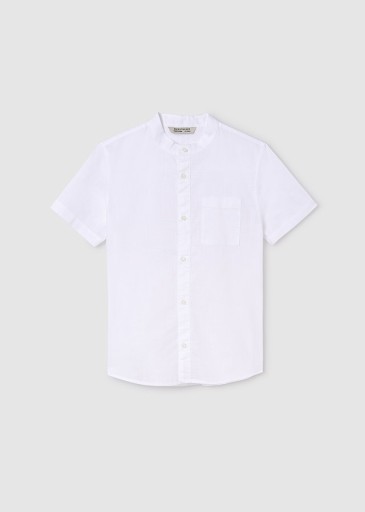 Koszula z krótkim rękawem dla chłopca od hiszpańskiej firmy Mayoral. Ubranko w 100% z bawełny. Model ze stójką. Zapięcie z przodu na guziki. Z przodu funkcjonalna kieszeń.