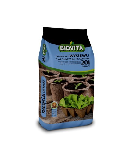 Ziemia do wysiewu i pikowania z włóknem kokosowym firmy Biovita o pojemności 20 litrów.