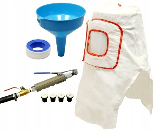 W zestawie, wraz z piaskarką, znajdują się ceramiczne dysze do piaskowania, taśma teflonowa oraz ochronna maska do piaskowania.