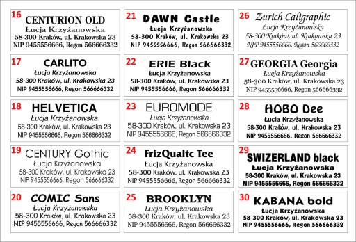 - MOŻNA WYBRAĆ CZCIONKĘ - można wybrać z naszych propozycji dołączonych do aukcji. Wystarczy podać nr czcionki. Jeżeli nie otrzymamy żadnych wytycznych dot. wyglądu pieczątki to pieczątkę wykonamy czcionką calibri.