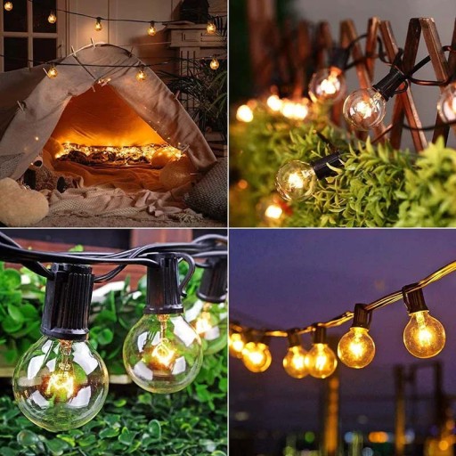 【Łańcuch świetlny na zewnątrz z 50 żarówkami】 Ta bajkowa lampa składa się z 50 wysokiej jakości wodoodpornych żarówek o łącznej długości 1520 cm, z odległością między dwoma żarówkami 30,5 cm. Może stworzyć przytulną i świąteczną atmosferę dla Ciebie i Twojej rodziny. Nadaje się na ślub, urodziny, boże narodzenie, Halloween, dekoracja wnętrz na zewnątrz