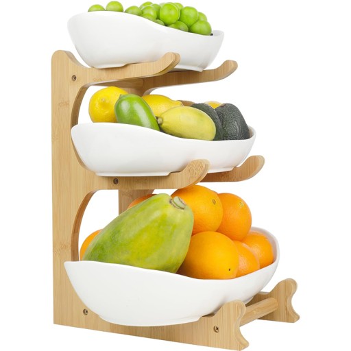 BAMBUSOWY STOJAK NA OWOCE 3 WARSTWY+ 3 BIAŁY CERAMICZNY TALERZ
