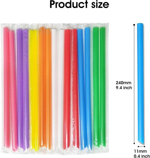 Gigantyczna słomka do smoothie o długości 9,45 cala jest pojedynczo pakowana w średnicę 0,43 cala (11 mm) i jest idealna do robienia gęstych koktajli i herbaty boba.