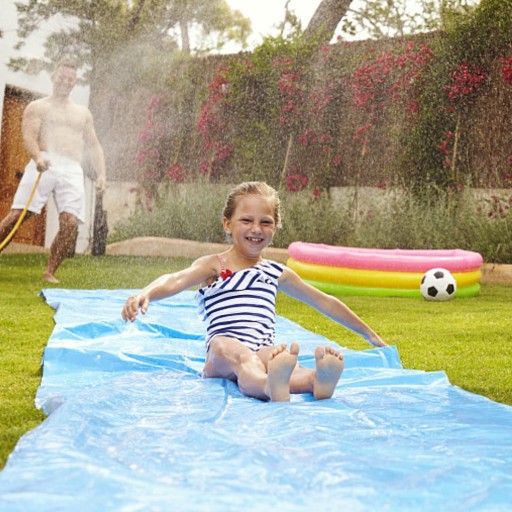 Do rozpoczęcia zabawy wystarczy nadmuchać deskę, brzegi ślizgawki oraz podłączyć wąż z wodą.