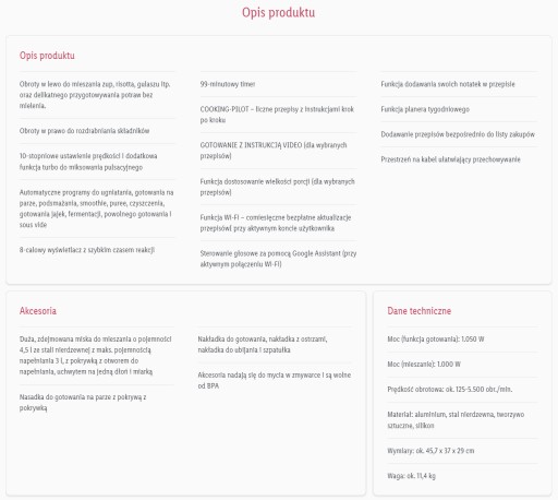 - Automatyczne programy do ugniatania, gotowania na parze, podsmażania, smoothie, puree, czyszczenia, gotowania jajek, fermentacji, powolnego gotowania i sous vide