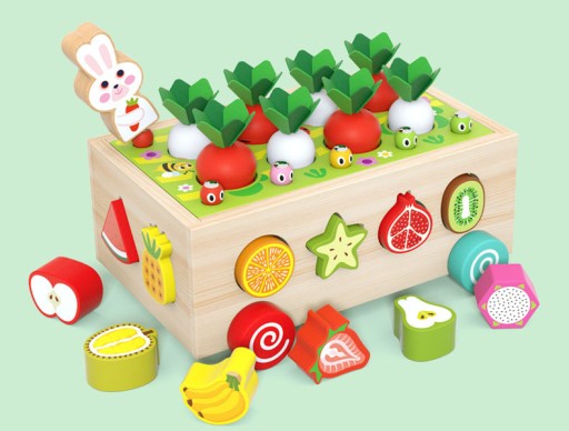 Oprócz tego na bokach tego sortera znajdują się otwory na różne owoce i warzywa, które sprawiają, że dziecko będzie chciało dopasować odpowiedni owoc lub warzywo, w dobre miejsce. Przy okazji możemy nauczyć dziecko nazw warzyw i owoców.