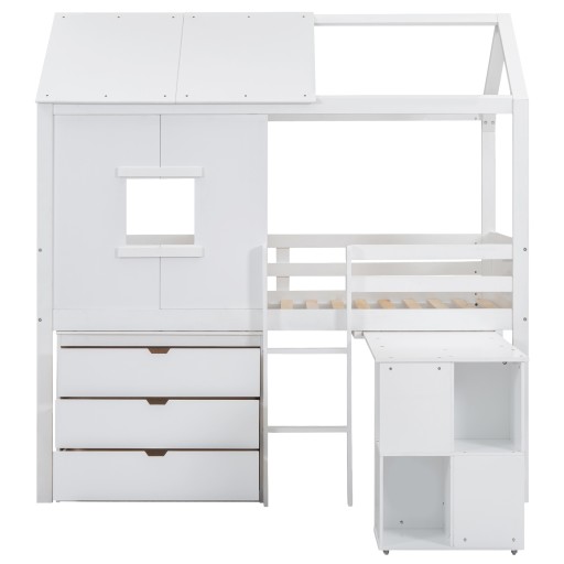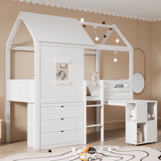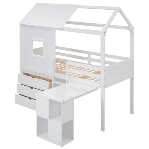 Łóżko na antresoli 90*200cm, łóżko dziecięce, kształt domku, rozkładany stół, trzy szuflady, biały